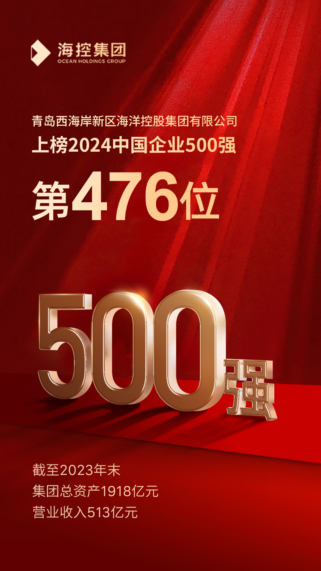 9月11日,2024中國500強企業(yè)高峰論壇在天津開幕。論壇現(xiàn)場,中國企業(yè)聯(lián)合會、中國企業(yè)家協(xié)會發(fā)布2024“中國企業(yè)500強”榜單,青島西海岸新區(qū)海洋控股集團有限公司(以下簡稱“??丶瘓F”)以513億元年營收榮登榜單第476位。