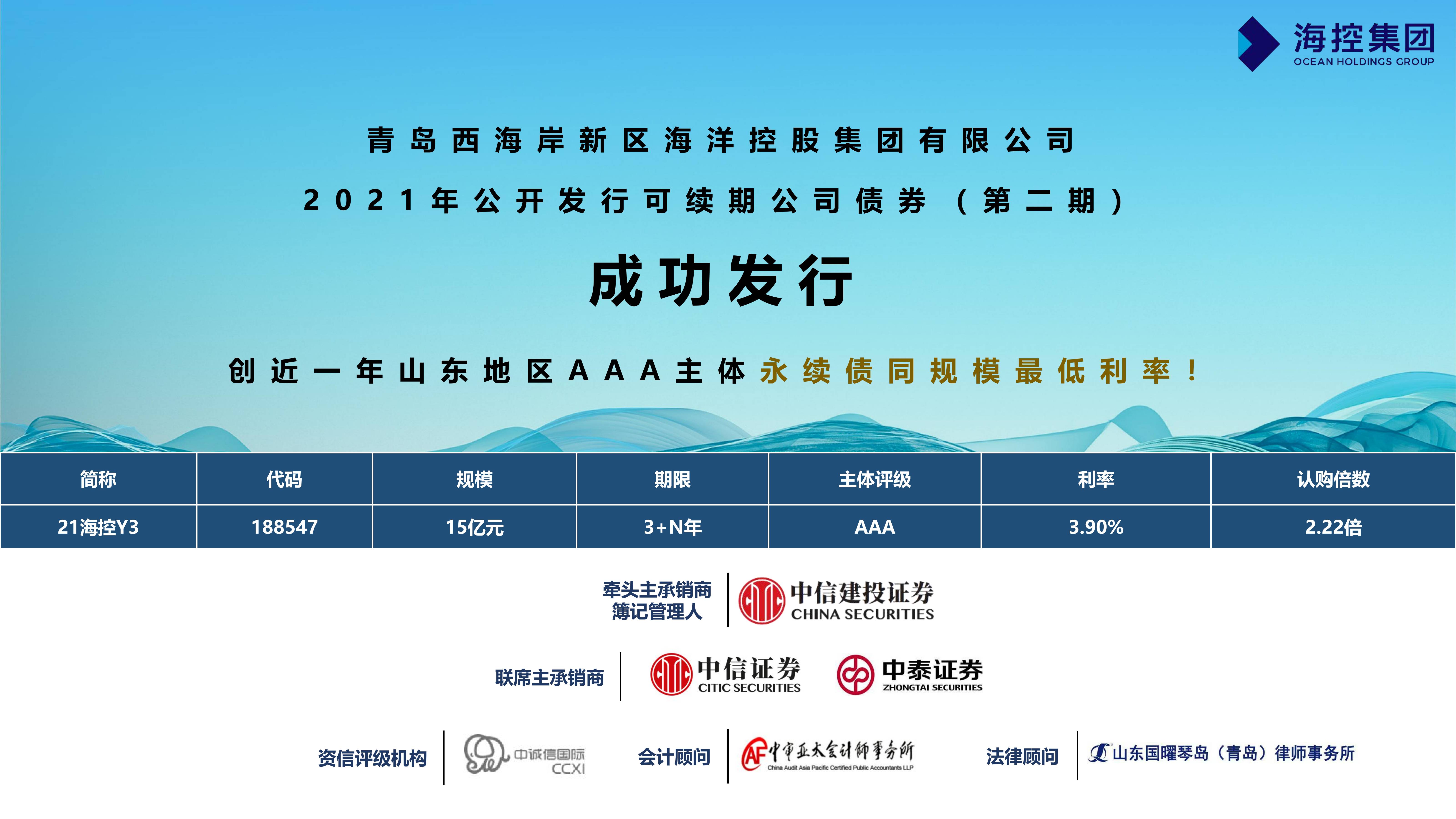 8月30日,??丶瘓F(tuán)“2021年公開發(fā)行可續(xù)期公司債券(第二期)”成功發(fā)行,期限3+N年,發(fā)行金額15億元,發(fā)行票面年化利率3.90%,創(chuàng)近一年山東地區(qū)AAA主體同規(guī)模最低利率。
